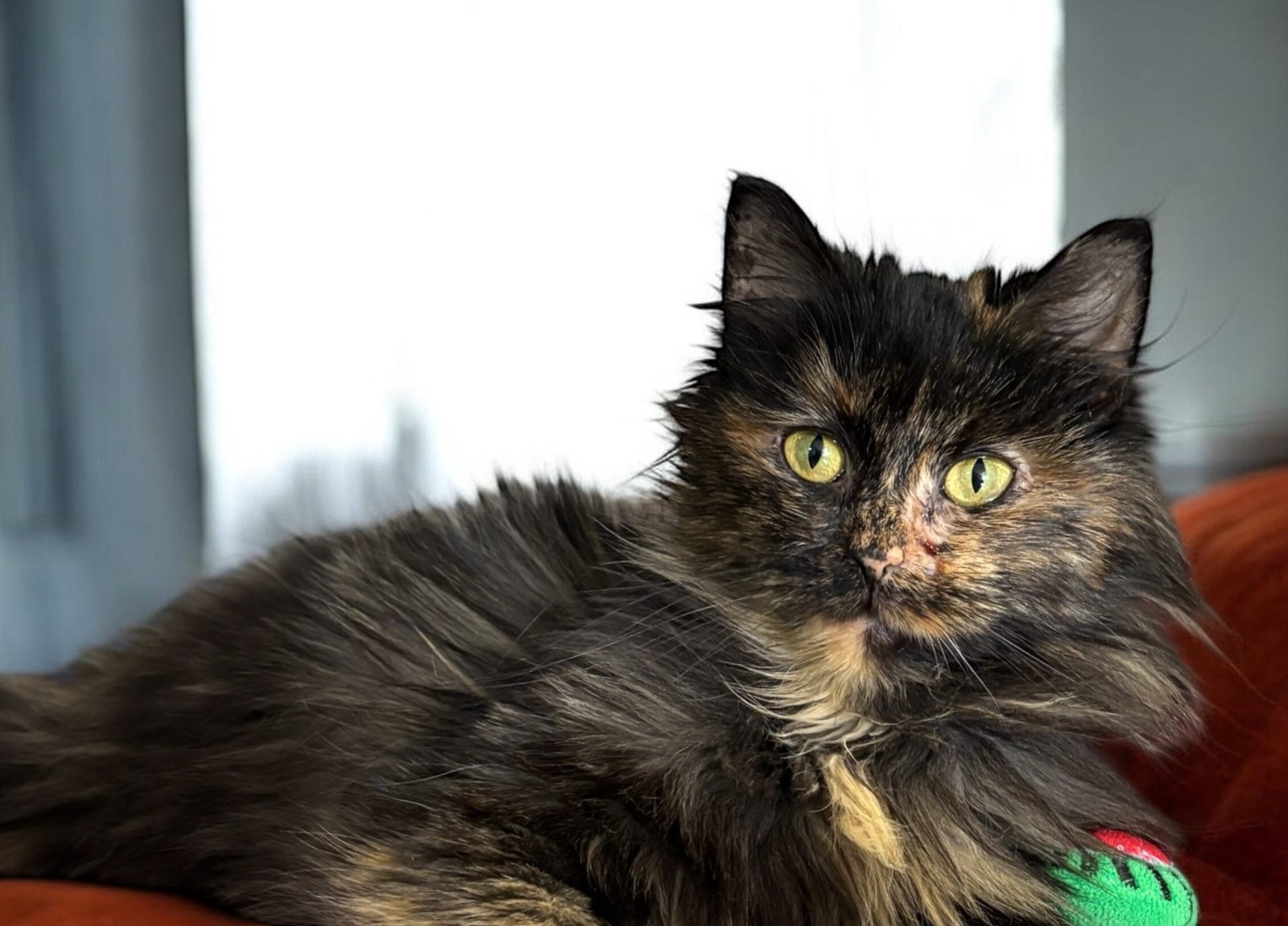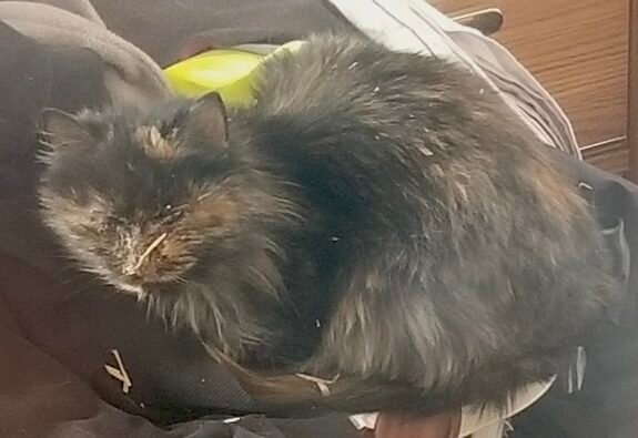 Hi… I’m Sweet Pea. 🌸🐾 I’m a fluffy little tortoiseshell girl, and I really, really like people. When the man found me, I was tucked into loose straw on the floor of his shed. It was