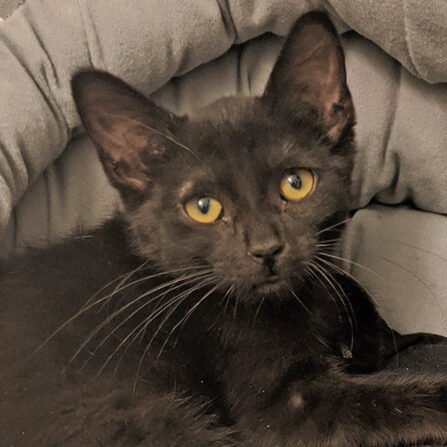 here and there. Then one day a neighbor was telling her about a little black kitten that was