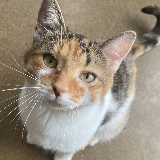 Edie is a pretty little calico cat who was rescued by a woman from her neighbour’s farm. This