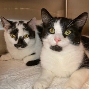 black and white fur, purring contently, wresting with each other and sharing toys. They like to