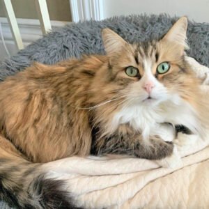 Tiffany has proven to be a very nice cat, gentle and sweet natured. She is good with people and not shy at all. When introduced into a new environment she was quite curious and wanted to see where everything was. She greets new people coming into the house and is quite interested when friends or family visit. Being a passive player, she likes things within reach, but the foster home has been enticing her with the laser pen light and wand toys. Tiffany would do best in a quiet home where there is not a lot of noise or sudden movements. We consider any cat over eight years old as retired, and there for the same type of home is looked for. This very pretty girl with the stunning green eyes is ready to be adopted into her forever home. One that will welcome her into the family and keep her safely indoors.