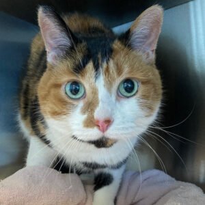 Cali has a beautiful calico coat and is a sweet cat who definitely knows who “her people” are..