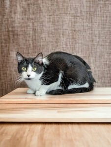 KittyKitty is an incredible cat. Both because of her petite body – forever the size of a five month old kitten, but also her loving and resilient personality that allowed her to overcome her difficult past. She’s learnt to trust others, play with strings and balls and chase treats on the floor. Her natural curiosity motivates her to explore, wanting to see every corner of your house and knowing everything you are doing. In the morning, KittyKitty waits patiently on your bed for you to wake up, then comes up to you and starts kneading your blanket hoping for pets. She’s a really skilled massage therapist. If you scratch her neck, she will enthusiastically drop her weight on your hand as she just can’t get enough. If you pet along her back, her tail will automatically shoot up along with her rear legs. Throughout the day she is happy to nap around you while you do work, approaching you every once in a while for some love. Winning her over is easy, as she loves food and will sit by her plate, calling you towards her by meowing sweetly. KittyKitty’s ideal home is one where she can be understood and loved, in a relaxed and safe environment, as an only pet or with other calm cats.