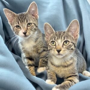 This bonded pair fit perfectly together. Katagan is gentle, affectionate, and absolutely adores being around people. Whether he’s curled up in your lap or following you from room to room, he’ll happily soak up every bit of love you’re willing to give. Katagan wants human companionship and plenty of snuggles with his people. Khanna is a confident and independent little tabby girl with a playful spirit. She loves to explore and entertain herself, often batting at strings or investigating every corner of the room. While she’s happy doing her own thing, she always goes back to her brother for sleepy time. She offers affection on her own terms and will reward your patience with soft purrs and sweet snuggles. Katagan and Khanna are ready to be adopted into their forever home. One that will welcome them into the family and keep them safely indoors.