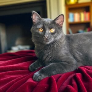 Ebyss is a striking black kitten with golden eyes that shimmer with curiosity. Adventurous and