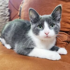 Lokym is a funloving and curious kitten who enjoys both playtime and quiet snuggles. He’s fascinated by everything—crinkly toys, rolling balls, or even your shoelaces. His gentle and easygoing personality makes him wonderful with children and other pets. After a good play session, he’s happiest curling up in a warm lap or snoozing beside his favorite human. Lokym would love to be adopted with one of his siblings, so he always has a buddy to share his playful energy. Lokym is ready to be adopted into his forever home. One that will welcome him into the family and keep him safely indoors.