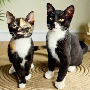 Éclair & Eccles are the friendliest duo you’ll ever meet. Eccles is the most “well-dressed gentleman” of the litter, always looking ready to attend the cuddle party—and you’re his +1. Bigger than his siblings, he’s also the biggest love bug. He follows people around the house, weaving between feet whenever he wants attention, and he’s always happy to oblige with loud purrs. Éclair is a dainty little calico with striking split-face coloring that makes her truly unique. She’s the quietest and calmest of her siblings, but she adores people and loves to cuddle up with her brother. Ball track toys are their absolute favorite—they’ll spend ages batting them around with enthusiasm. That’s until someone initiates a wrestling match! Despite Eccles’ size, he is a true gentleman is often lets his sister win. Éclair & Eccles are ready to be adopted into their forever home. One that will welcome them into the family and keep them safely indoors.