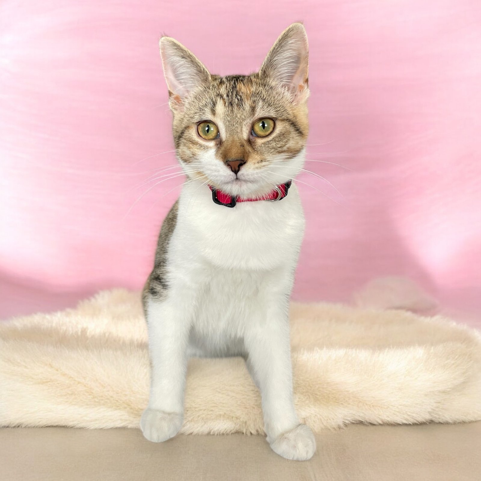 Sophia is a beautiful calico tabby girl who looks just like her mama, Stella. The largest of the litter,