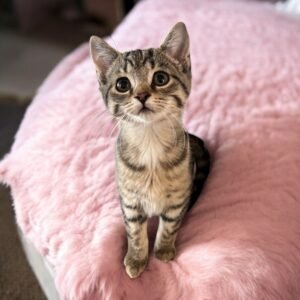 Abigail is a playful tabby with a warm, cuddly personality and a very chatty nature. She loves exploring and chasing toys, then settling in close for snuggles when playtime is over. Her sweet meows keep her part of every conversation, and her affectionate side makes her easy to fall in love with. Abigail is ready to be adopted into her forever home. One that will welcome her into the family and keep her safely indoors.