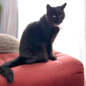 Pixley came from a trailer home belonging to a very elderly woman whose health had declined significantly. The home was in deep disrepair, dark and stuffy, with raccoons having broken in through holes in the structure. When she arrived at Pet Patrol, it was clear that while she had been fed, her care had been lacking for some time. His and a companion, Gus, were covered in fleas, their coats dull and sun­ scorched, and their bodies scratched from navigating the cramped and cluttered space. What should have been sleek black fur appeared almost sable in color from sun damage and poor conditions. They ate and drank ravenously upon arrival, and although frightened at first, it didn’t take long for them to relax in their new, clean environment. With steady care and a quiet space to decompress, Pixley and Gus have both begun to heal—physically and emotionally
