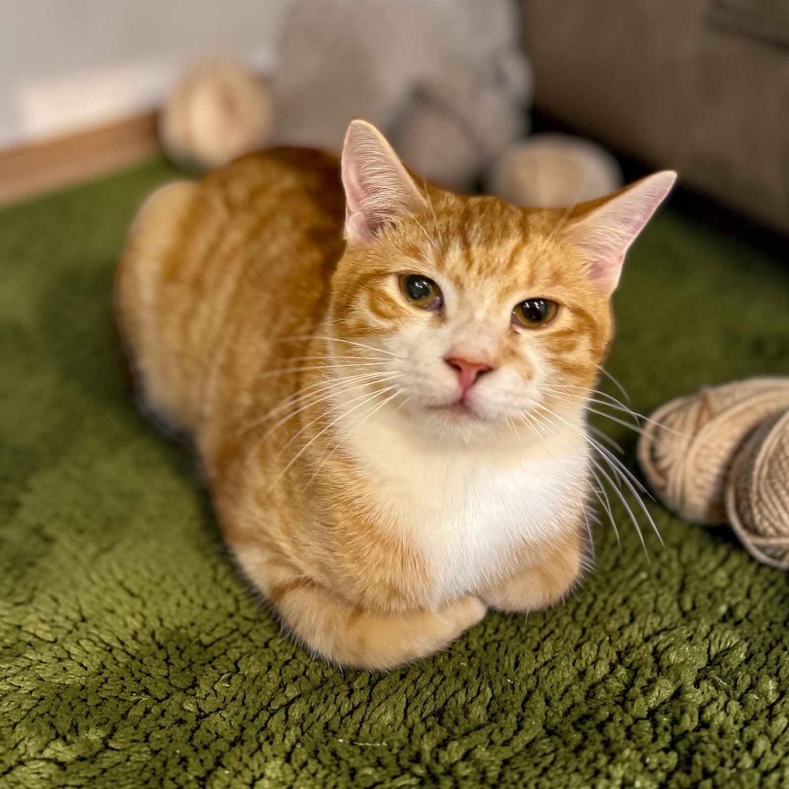 finding cozy spots to relax, whether that’s tucked into a little cat house or curled up next to her