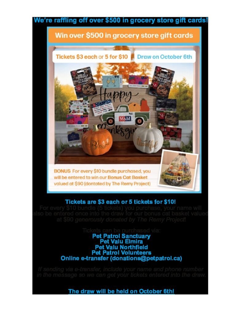 Tickets are $3 each or 5 tickets for $10!For every $10 bundle (5 tickets) you purchase, your name willalso be entered once into the draw for our bonus cat basket valuedat $90 generously donated by The Remy Project!Tickets can be purchased via:Pet Patrol SanctuaryPet Valu ElmiraPet Valu NorthfieldPet Patrol VolunteersOnline etransfer (donations@petpatrol.ca)If sending via etransfer, […]